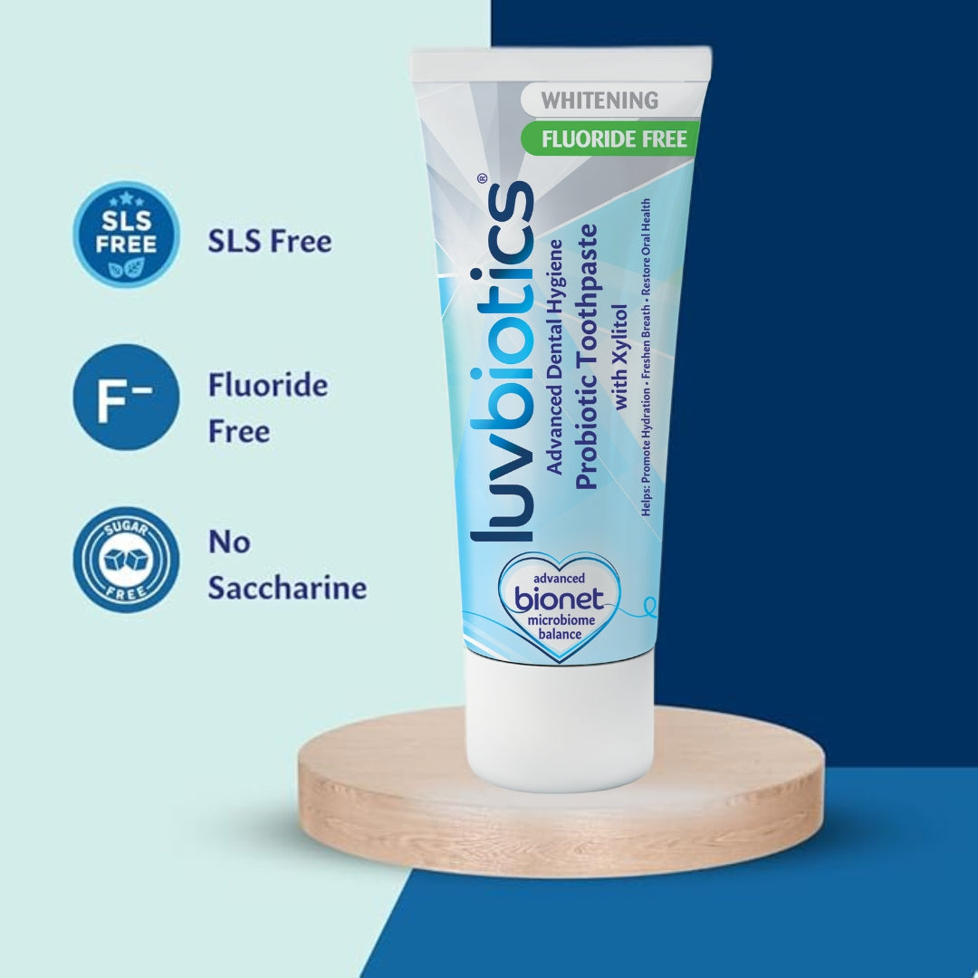 Luvbiotics Fluoride free Whitening toothpaste uses Bionet technology powered by probiotics and xylitol with natural ingredients, to promote healthy oral microbiome and balance oral flora for a happier, healthier mouth. Free from SLS, Fluoride, parabens, artificial colours and preservatives